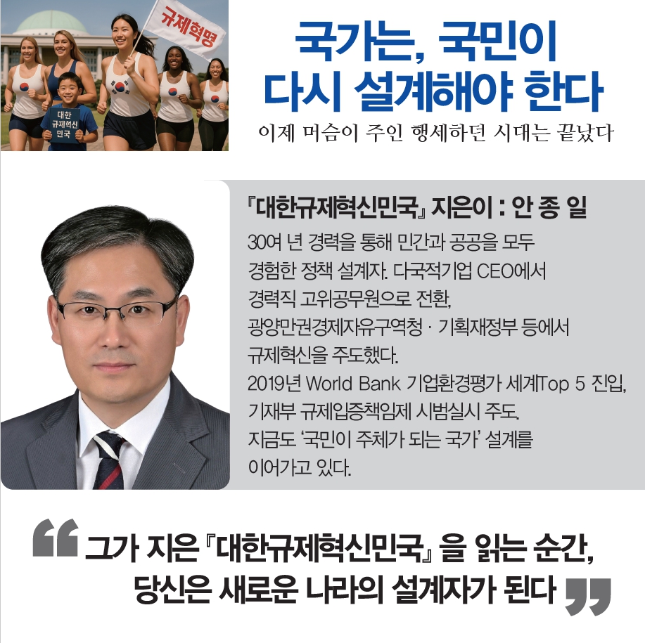 현재는 다양한 공공기관과 정책 현장에서 자문과 강의 활동을 이어가고 있다. 안종일 동문은 이번 책을 통해 단순한 비평을 넘어, 국민이 직접 국가 설계에 참여하는 길을 제시하고자 했다. 『대한규제혁신민국』은 그간의 경험과 문제의식을 집약한 결과물로, 동문 사회는 물론 우리 사회 전체에 중요한 메시지를 전하고 있다.