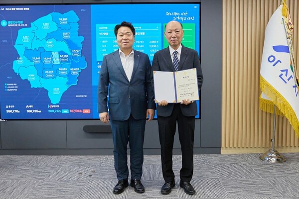 ▲ 이경헌 스파산업진흥원장(오른쪽) 임명. 왼쪽은 오세현 아산시장.