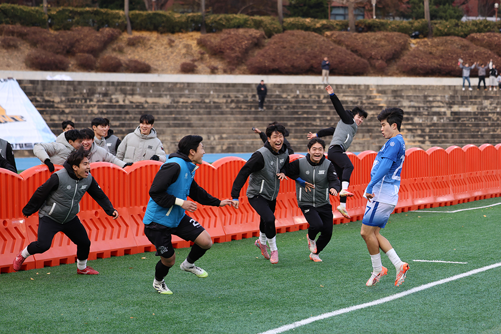 우리 대학은 후반전 13분 울산대에 선제골을 허용하며 끌려갔지만 후반 24분 코너킥 기회에서 곽희벽 선수가 헤더로 승부를 원점으로 돌렸다. 이어진 연장전에서 주우재, 권병준 선수가 연이어 골을 성공시키며 3:2 스코어로 최종 우승을 차지했다.